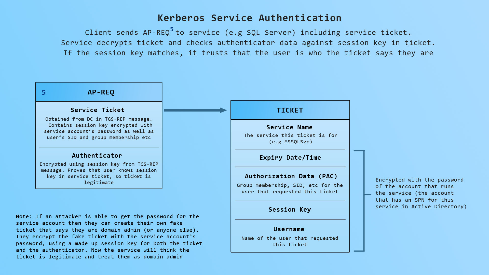 Then finally the AP-REQ message for step 5. Note that this message won’t usually be easy to see in network captures because it will be sent over whatever protocol the client communicates with the network service with (e.g HTTPS, SQL’s network protocol, or some proprietary protocol created just for this service):